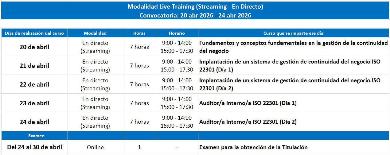 El programa Auditor/a líder de continuidad del negocio ISO 22301 proporciona una formación completa sobre la norma ISO 22301, tanto para su implantación como para asumir responsabilidades en un sistema ya implantado. En los diferentes módulos se explican los requisitos de esta norma y cómo auditarlos, y se profundiza en temas específicos como el análisis de impacto y el plan de continuidad del negocio.