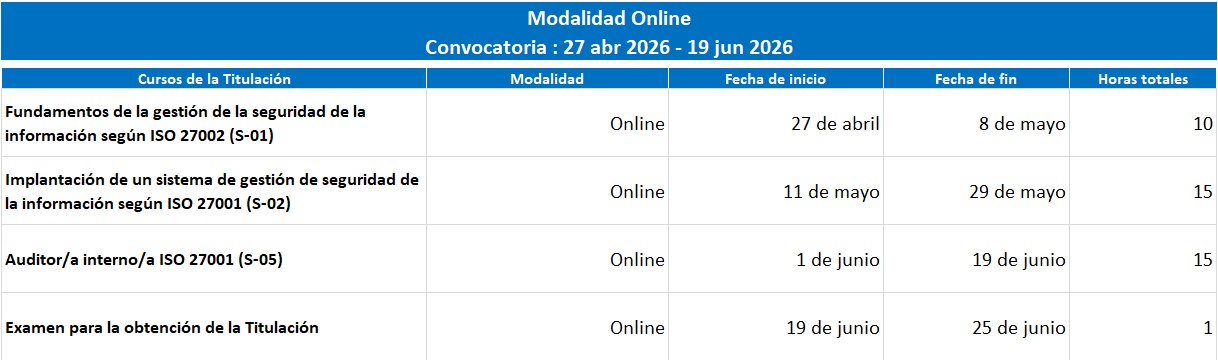 Si posteriormente deseas complementar tu formación con la Titulación Propia de AENOR Especialista Implantador ISO 27001 , sólo tendrás que realizar el curso Gestión de riesgos en seguridad de la información (S-03) y podrás beneficiarte de un 20% de descuento en el precio del curso. Descuentos no acumulables.