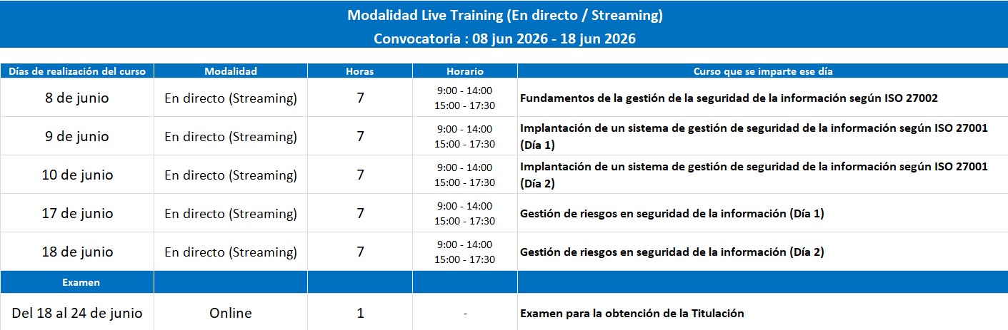 Para obtener la Titulación Propia de AENOR Especialista Implantador ISO 27001 deberás realizar los cursos S-01 , S-02 y S-03 , preferiblemente en el orden establecido y superar los exámenes que se llevarán a cabo durante la realización del programa.