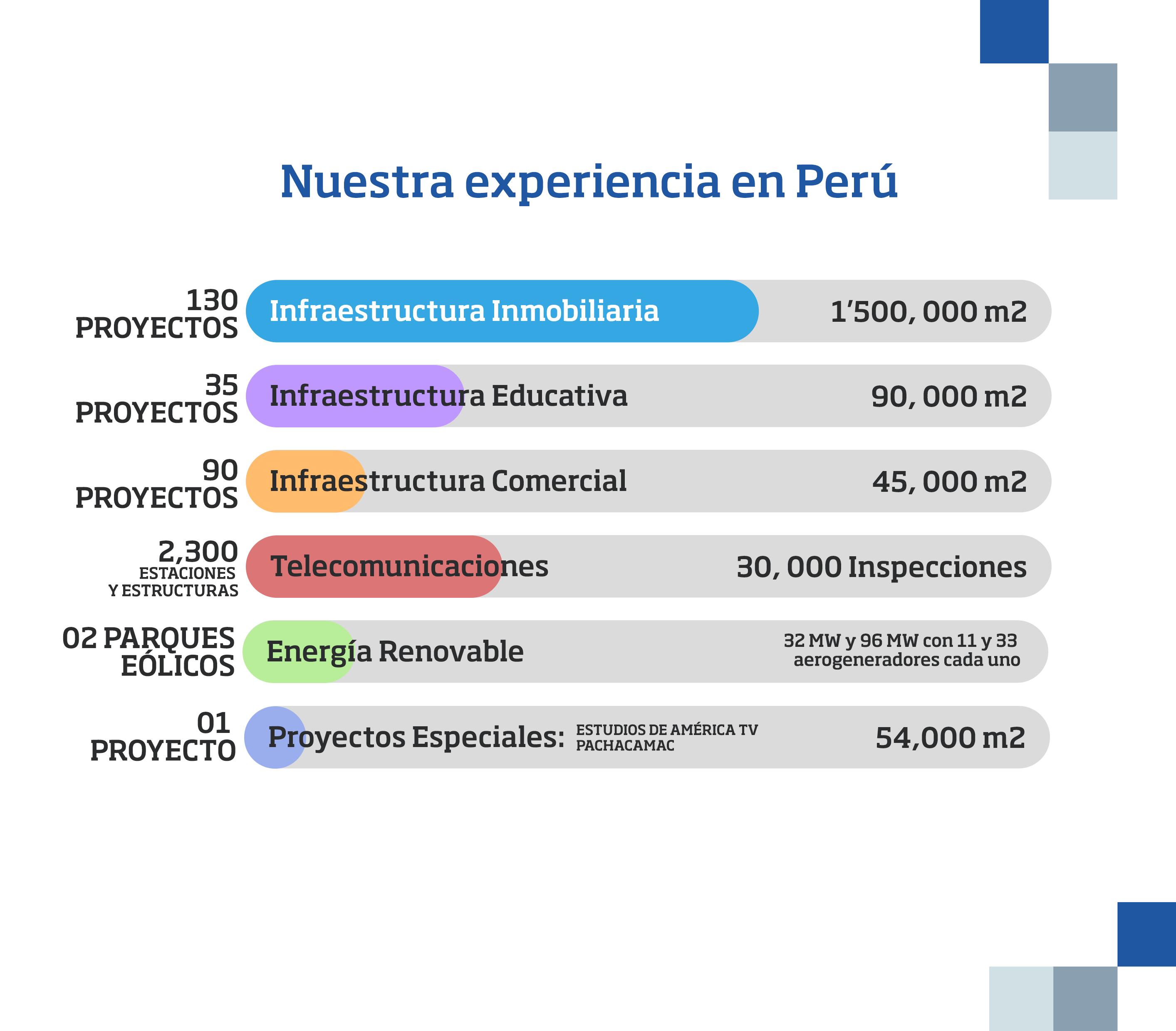 A lo largo de estos años hemos participado en la gerencia y/o supervisión de numerosos proyectos en el país tales como Proyectos Inmobiliarios, Oficinas Corporativas, Oficinas Comerciales, Agencias Bancarias, Proyectos Educativos, Mercados, Proyectos de Agua y Saneamiento, Proyectos de Pavimentación, Proyectos de Energía Eólica o Proyectos especiales como el Nuevo Centro de Producción Audiovisual con 5 estudios de 4000 m2 de AMERICA TV