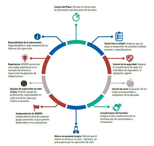 AENOR en Perú, desde el 2007 viene apoyando a distintas organizaciones tanto públicas como privadas, a que los proyectos en los que invierten se realicen de acuerdo a las especificaciones técnicas y normativas vigentes, bajo los estándares de Calidad, de Seguridad y Conservación del Medio Ambiente, dentro del marco contractual con las empresas contratistas, realizando el seguimiento de los plazos previstos y aprobándose los volúmenes de obra realmente ejecutados. Hemos Gerenciado y/o Supervisado proyectos por más de 1,000 millones de USD$